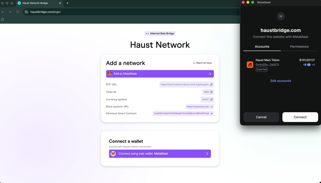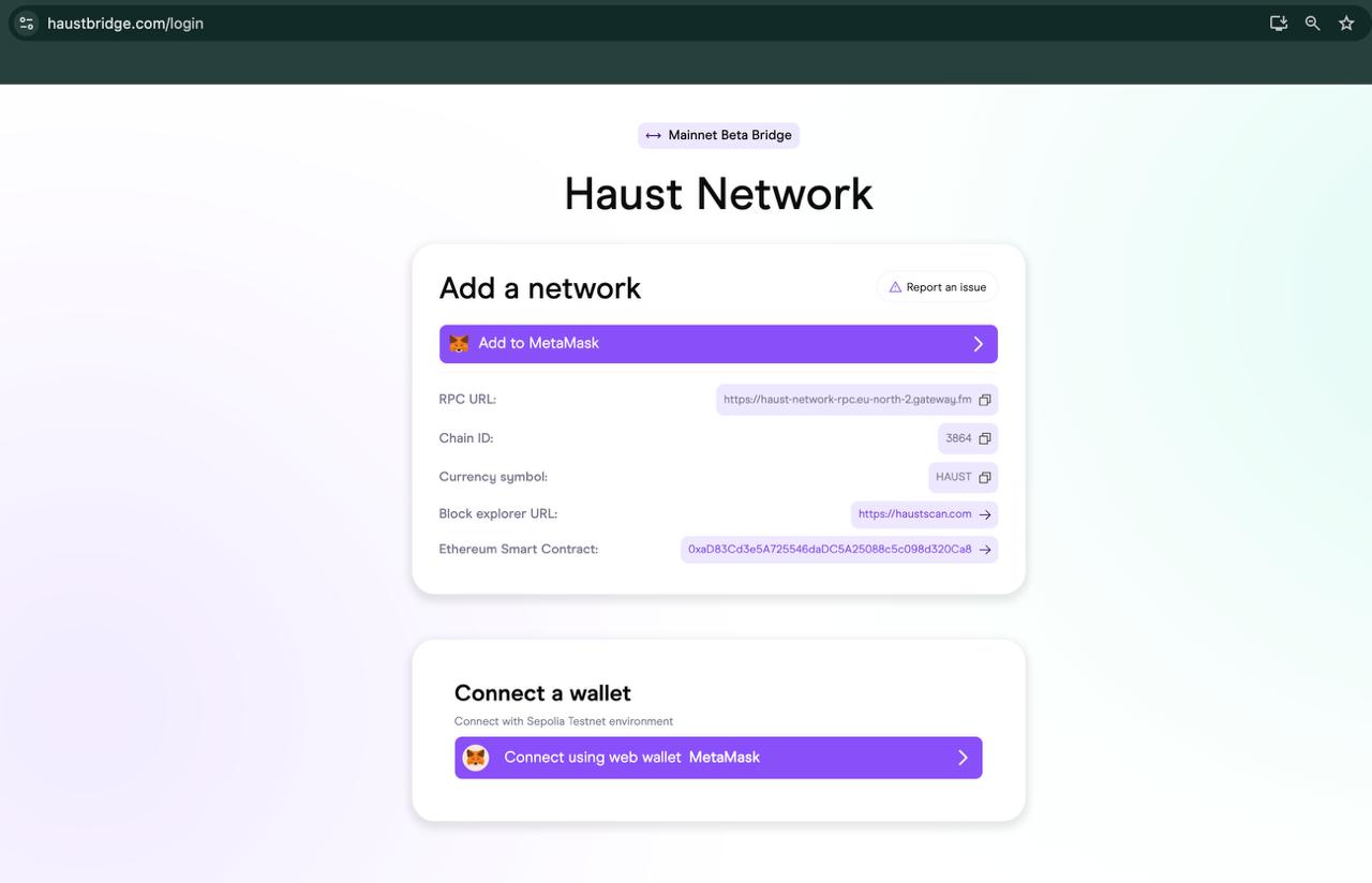 Please connect your wallet to [Haust Bridge](https://haustbridge.com/login), press **Connect** using web wallet